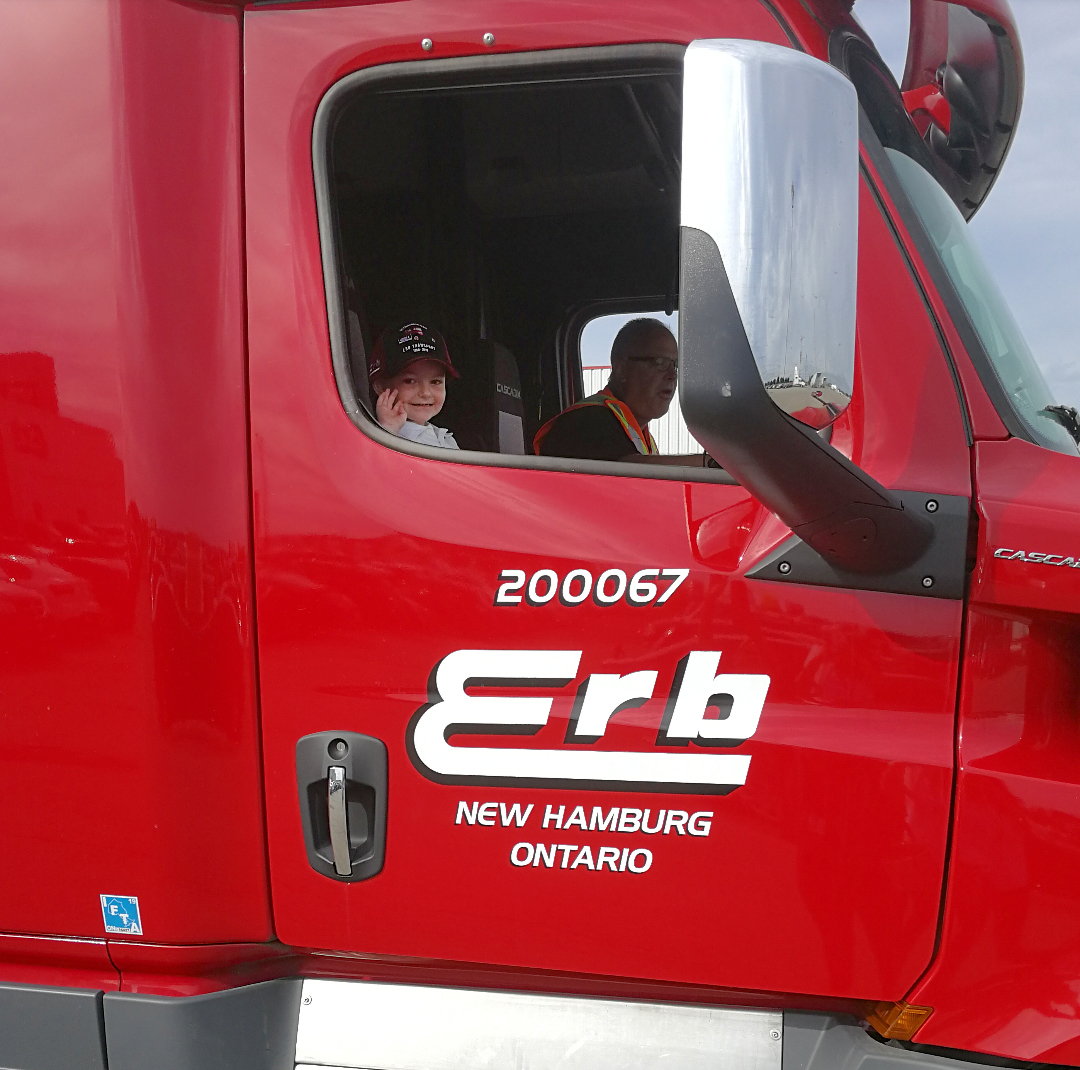 Nathan Snyder inside a transport truck with Scott Misener
